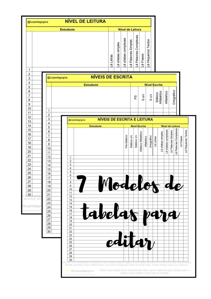 Guia Prática da Alfabetizadora do 1º e 2º Ano: Estão disponíveis sete (7) Tabelas de registros para contabilizar os níveis após os testes de leitura e escrita. Após a sondagem ou colega de leitura e escrita, as tabelas servem para registrar o nome e o nível, tendo um panorama geral de como está o grupo. Disponível no google drive para abrir, salvar e editar com os nomes dos seus estudantes.